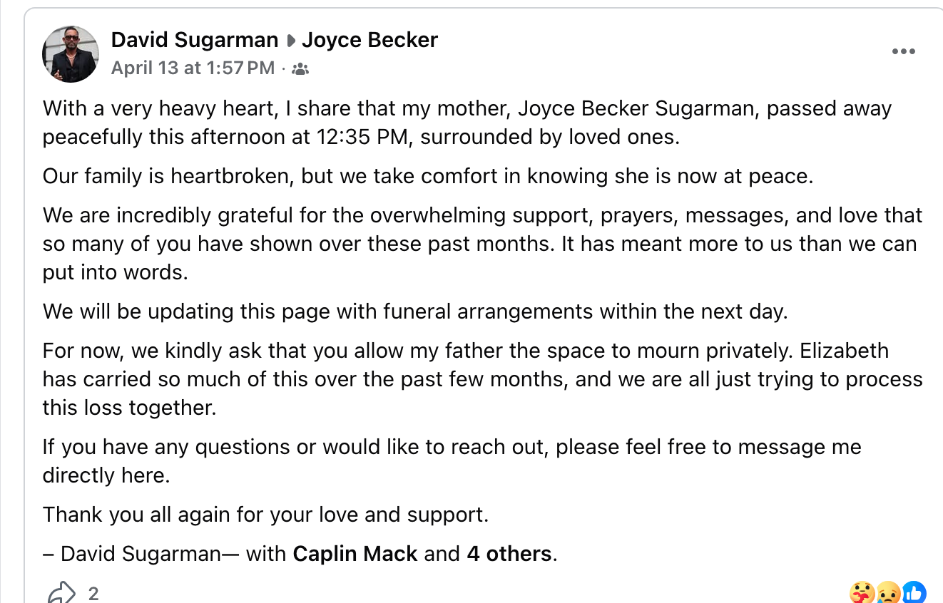 1. Joyce Becker, who wrote for several soap magazines and organized the soap opera fan festivals starting in the 70s has died. Dignity MemorialJoyce Becker Sugarman Obituary - Manalapan, NJCelebrate the life of Joyce Becker Sugarman, leave a kind word or memory and get funeral service information care of Bloomfield-Cooper Jewish Chapels.