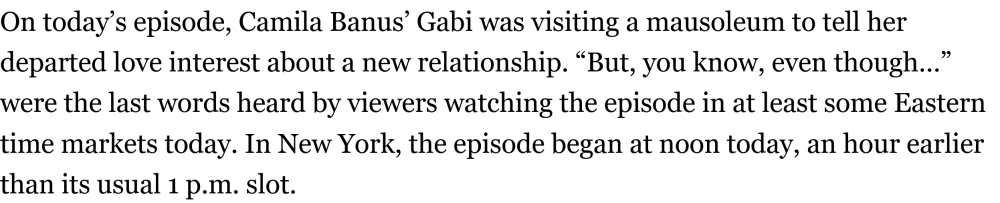 So, to preface, I've not seen an episode as it aired in years. My first reaction was that the number of commercials was staggering. There would be two scenes and then an immediate barrage of medications, prime time previews, and fast food. I miss the old educational scams of modeling and nursing schools, but I guess it is good to see the progress that student loan reform has had on daytime sponsorship. Also, I look forward to Peacock if it means less interruptions for my $1.99 per month. There was a chyron in each scene reminding viewers of the move. I liked the Maggie/Jenifer stuff. Even though we've seen very little of Jennifer's dependency, it was dramatic and played on all of the beats of history and family relationships that I like to see in soaps. But, Alice Horton would be horrified to see the state of her floors that were all scuffed and dusty. Also, are we just supposed to not notice that they've changed the entrance to the Horton house after 57 years? The Alex/Stefanie stuff was inoffensive. I find the actress playing Stephanie to be charming. I have no idea why she would be so proud of writing a press release, or why Titan needs to announce an interim CEO, given that the press would probably be more focused on Sonny, but it is good that she's staying busy. I can't help but look at Alex and think that in a prior generation it would be odd that this 34-year-old character wasn't more mature rather than still trying to be a quirky romantic lead. Don Craig and Neil Curtis weren't still being cute and coy at that age, and they knew to wear a tie in the workplace. Leo's attorney needs to be immediately dis-barred for disclosing confidential conversations to the police. And what cop lets a civilian walk in front of them when they're holding a gun? Also, I get the wig, but did Leo also have the time to get lipstick and fake boobs? I mean if a guy waking up from a stab wound could immediately recognize him, I don't think the boobs mattered...- All My Children Tribute Thread