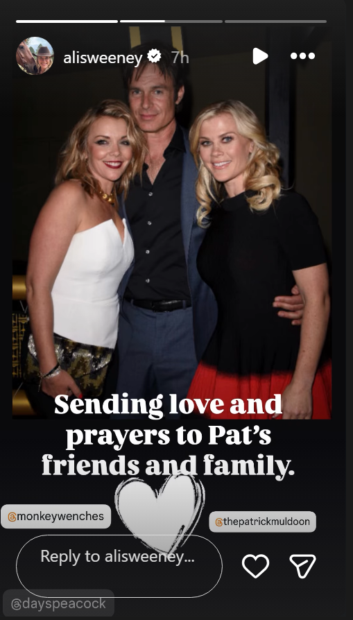 Stephanie Sloane (ig soapsteph) https://www.instagram.com/p/DXWmv28AGbm/ What a heartbreaking story to wake up to. I had the pleasure of speaking with Patrick over the years, and he really made every conversation a good one - always fun and upbeat. 57 is way too young. I’m thinking of his family, friends, and his @dayspeacock family, and sending deepest condolences. Rest in peace, Patrick.- RIP Patrick Muldoon