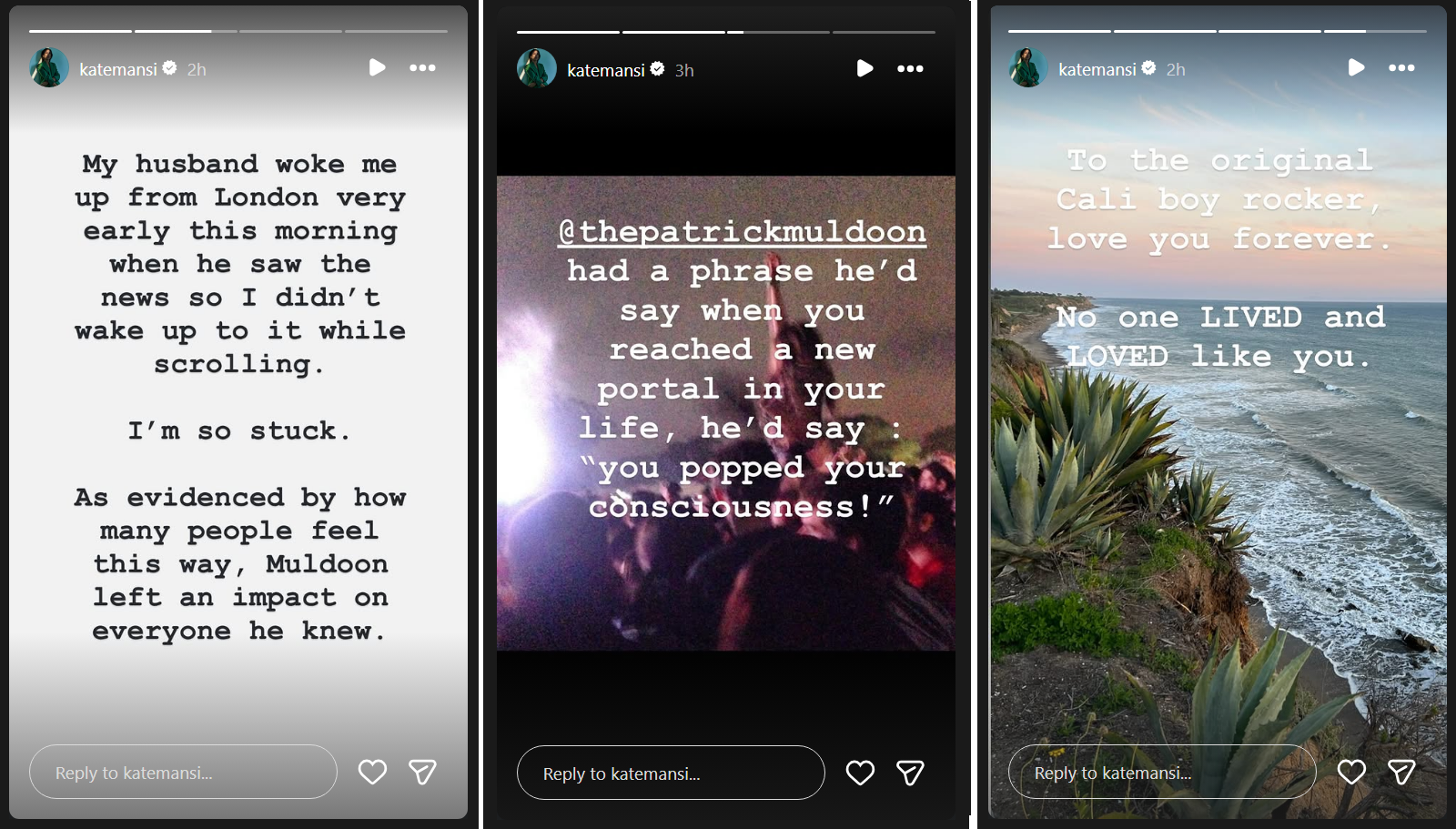 Here's the original of Christie's IG post https://www.instagram.com/p/DXXIRM5jKNu/ monkeywenches (Christie Clark) This gorgeous Irish man was just as beautiful inside as outside. P Muldoon made anyone that met him fall in love with him. Thank you for the hard belly laughing, nostril flaring uproarious good times I had with you. They’re imprinted on my heart and soul. My Irish friend, Jim morrison/Marlon Brando re-incarnated, lover of life & music. Sending massive hugs to his most prized people, Deanna, Patrick Sr, Shana, Amhet, Halo, Arrow and of course his love Miriam. Thinking of you. This song was C&A love song for years on #daysofourlives And with this song and so many other songs, I will always think of you when I hear this and smile and think of my lovely mischievous and much missed beautiful friend. This is from the comments section on Christie's post: marth27 Thinking of you and sending so much love. katemansi No one made us giggle like Muldoon deidrehall_official Christie, how tenderly and expressively put. Thank you. ericmartsolf Beautiful. ggering I want to wake up from this bad dream. Patty was the best!!!Always so funny and full of energy and love. The world lost a great man. 😞Rest in Power my man. charlotteross2 🙏🏼💔- BTG: Y&R/B&B/GH actress joins the show