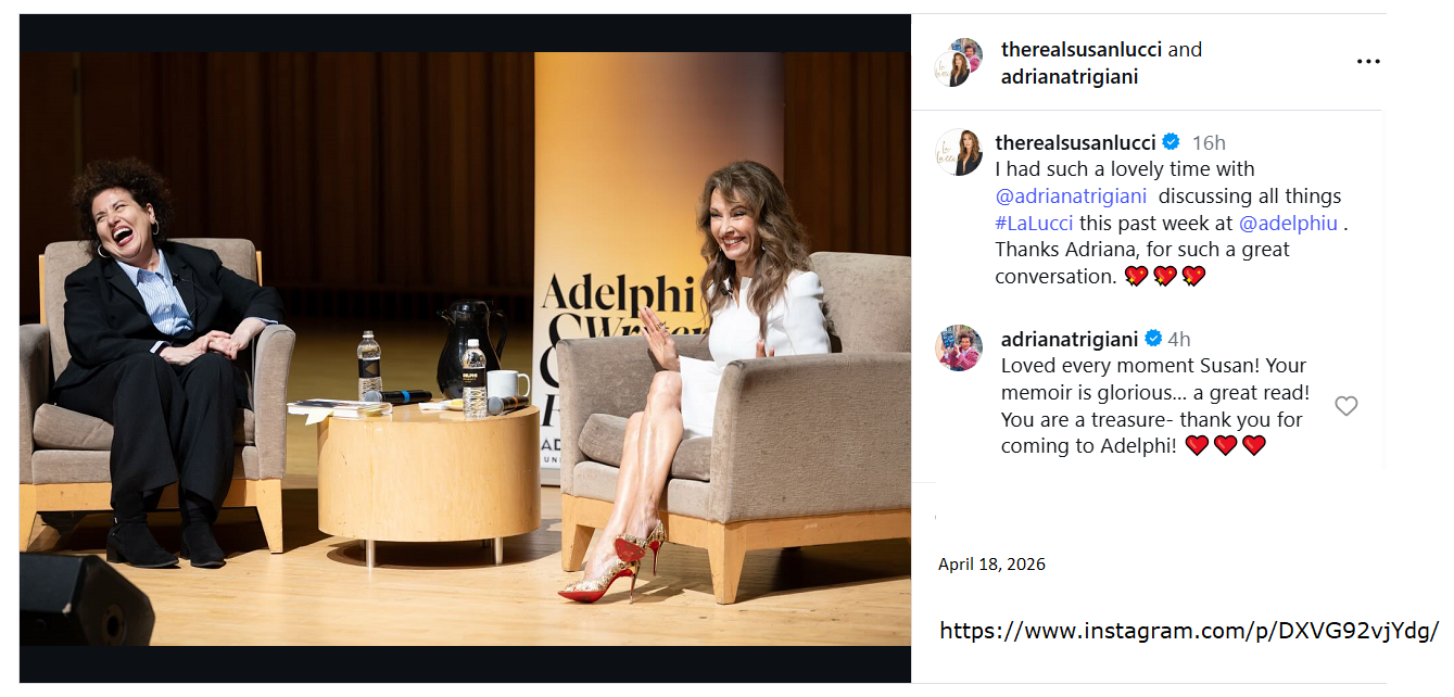 Susan Lucci was a featured author at the Adelphi University Writers and Readers Festival. The festival was April 15-17, 2026. Susan was featured on April 15. https://www.adelphi.edu/writers-readers-festival/ pics here https://www.instagram.com/adelphiu/p/DXNAIwplarC/ adelphiu We had a great time last night at An Evening With Susan Lucci during our Writers & Readers Festival! Thank you to everyone who joined us. #AdelphiU #writers #readers https://www.instagram.com/p/DXVG92vjYdg/ therealsusanlucci I had such a lovely time with @adrianatrigiani discussing all things #LaLucci this past week at @adelphiu . Thanks Adriana, for such a great conversation. 💖💖💖 adrianatrigiani Loved every moment Susan! Your memoir is glorious… a great read! You are a treasure- thank you for coming to Adelphi! ❤️❤️❤️- RIP Patrick Muldoon