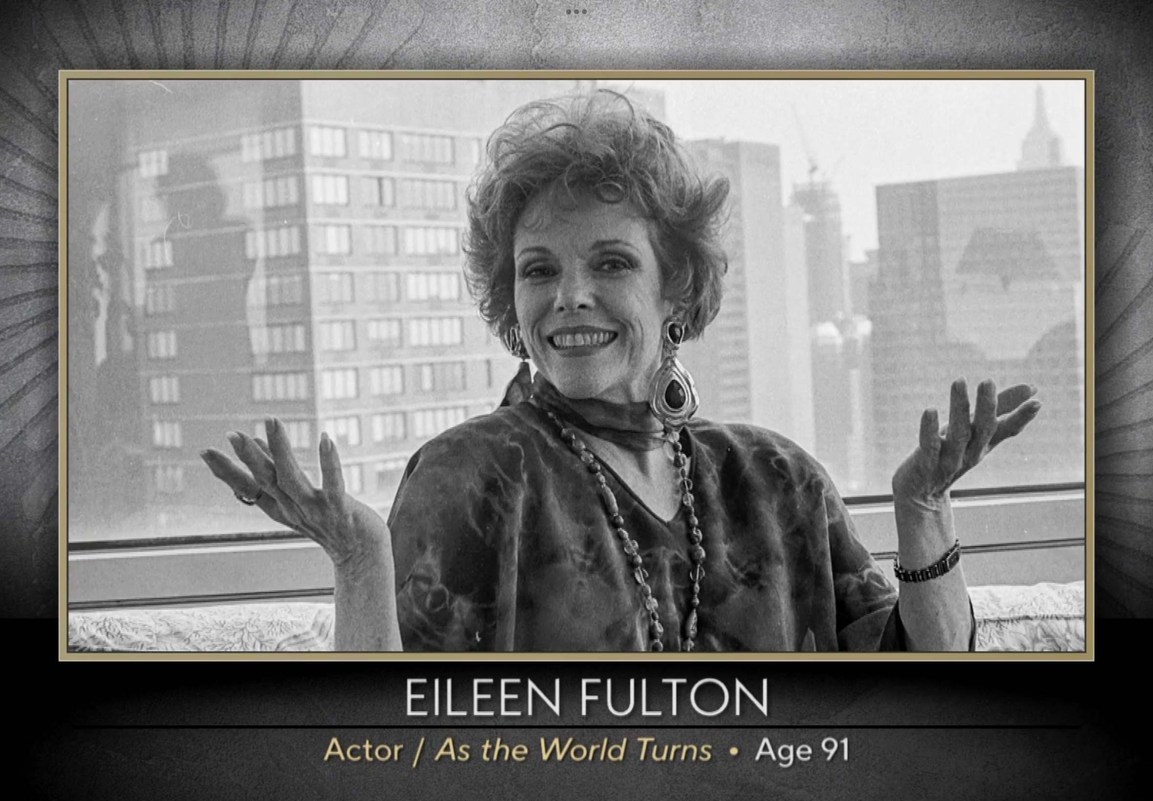 finally! finally, cbs sunday morning recognized an actor from a p&g soap in ‘passages.’ of course, had eileen fulton passed away in a week not dominated by so many notable deaths, she might have rated a short clip noting her 50 years on ‘world turns. but given the show’s shameful neglect of other ‘world turns and guiding light actors — no mention of kathryn hays, elizabeth hubbard, lisa brown or jerry ver dorn — this is something, albeit, long overdue.- Dark Shadows Discussion Thread