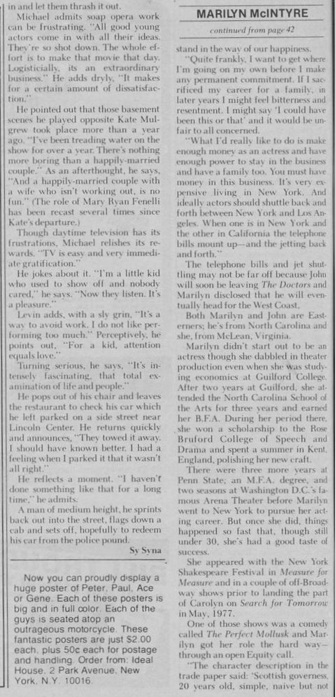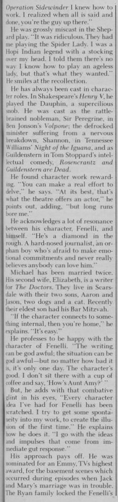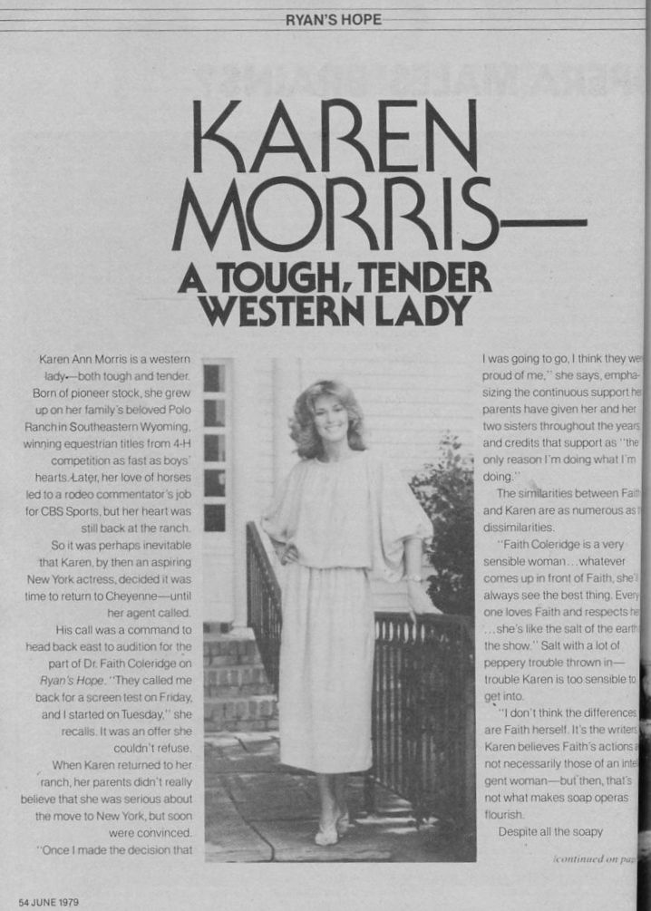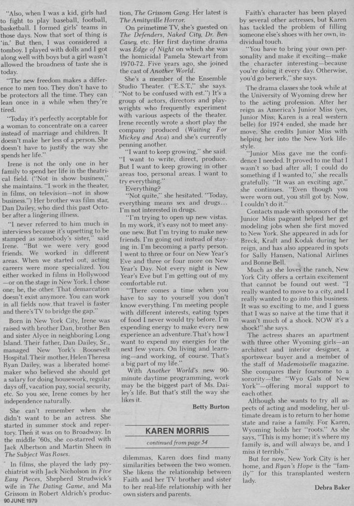 The creators of the daytime soap opera Ryan's Hope wrote the part of Dr. Faith Coleridge for her, but she had already committed to star in the original Gardner McKay written, Norman Lloyd produced PBS show, "Me", with Richard Dreyfuss and Geraldine Fitzgerald.