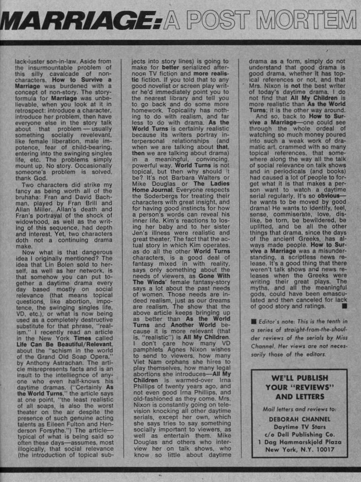 Great article that really reinforces what has been said about HTSAM. Channel seems to focus on the early days but I have read the show became more traditional and 'soapy' later on. She was no fan of Agnes Nixon!
