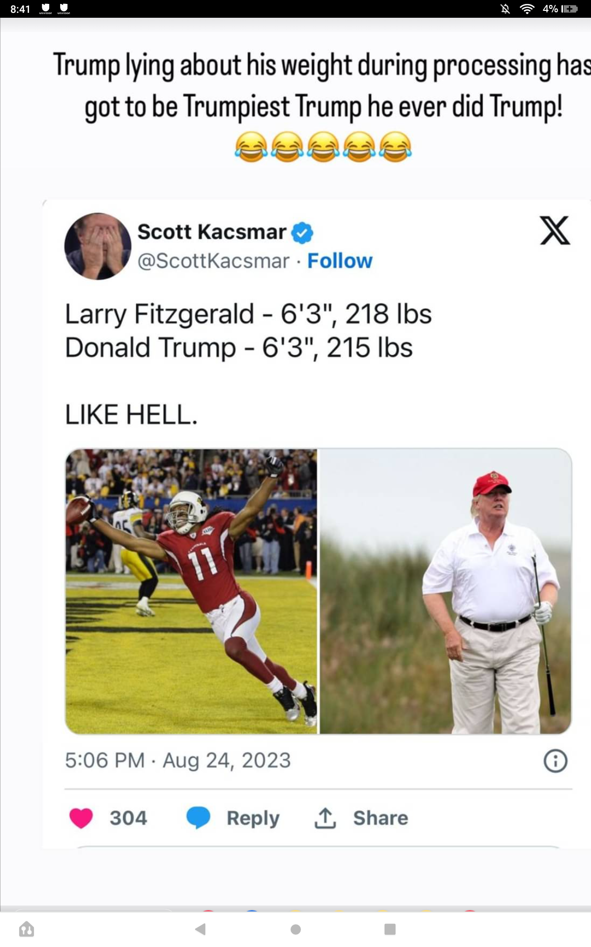 Apparently, Trump’s aides filled out his arrest intake form in advance, hence the description of him being 6ft3 and 215 pounds, almost 30 pounds lighter than his early days in the White House and his shade of hair being described as strawberry blond, instead of a weird shade of cotton candy most likely found at the oddities section at an old-time county fair or traveling circus.
