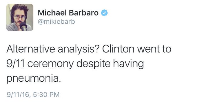 A great example of how the media is spinning this (and likely had this written up in waiting for a while now...): I had to laugh at the part where they said she was summer's "sure-thing candidate" when it was only a month or so after the disastrous convention that the press wasn't going on about how the race was tight and Trump was kicking ass. They love the pro-Trump narrative and love finding ways of making it a reality, even to the point of using this wobble to say Trump is right about her health. I hate the spin that today made this a "real issue" for the race. It became a real issue when the media reported on it endlessly. It became a reality even if Clinton had spent the whole campaign running a marathon. I think she made a mistake with how she handled this, but it doesn't even matter. She's damned by a Trump-loving media no matter what.