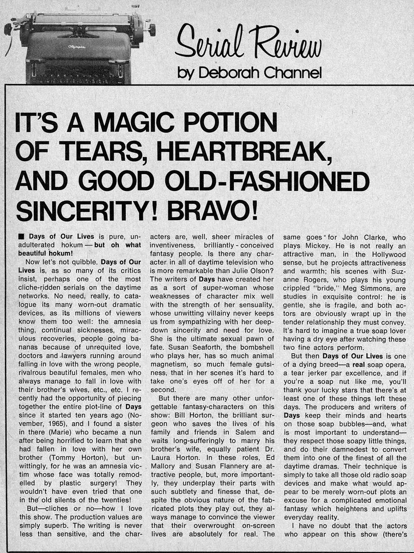 DAYS was okay during its first season, but it was not really exciting, and did not really catch fire, until William J. bell took over as headwriter. That's why I say I'd like to see all the 1966-76 episodes again, although I certainly would enjoy watching the series from its 1965 debut, even if it did get off to a slow start.