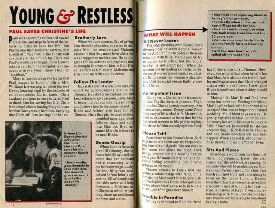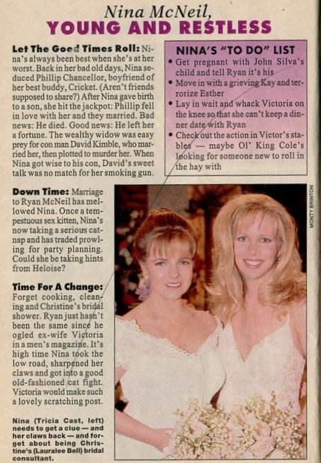LOL at Nina's "To Do" List, especially the Harding/Kerrigan reference. Unfortunately had Pratt been writing Y&R in 1995 I'm certain all of those ideas would play out on screen.