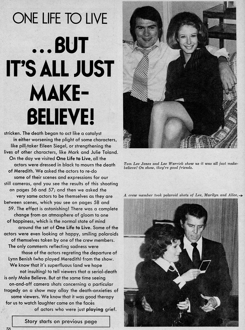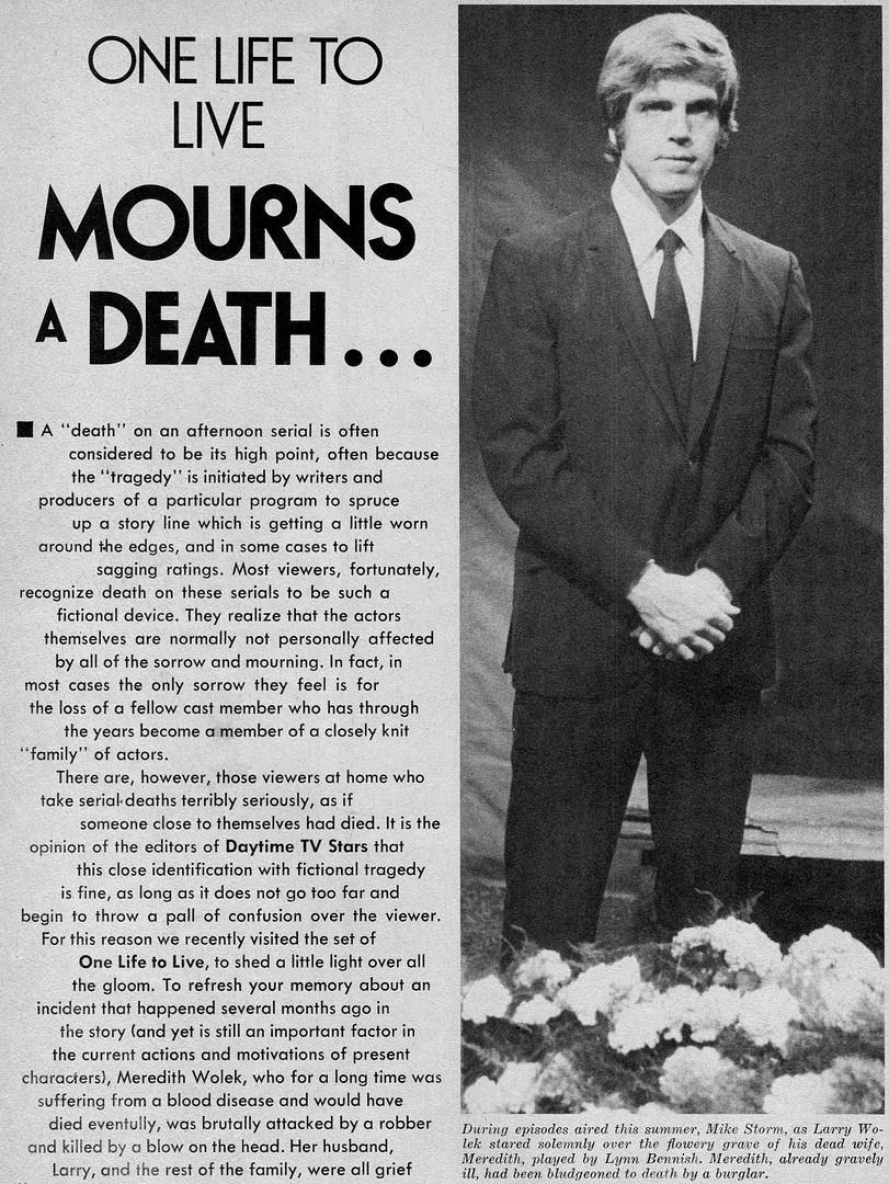 Meredith was such a sweet character, and an important part of two core families (the Lords by "birth" and the Woleks, by marriage), I could never understand why they killed her off instead of mining more story potential for her. Victor Lord was apparently not Meri's biological father, and the show could have used that point to spin various, interesting scenarios for the Lord family. Maybe the writers wanted to free up Larry Wolek for other romances, and he did end up having an amazing storyline with Karen a few years later.