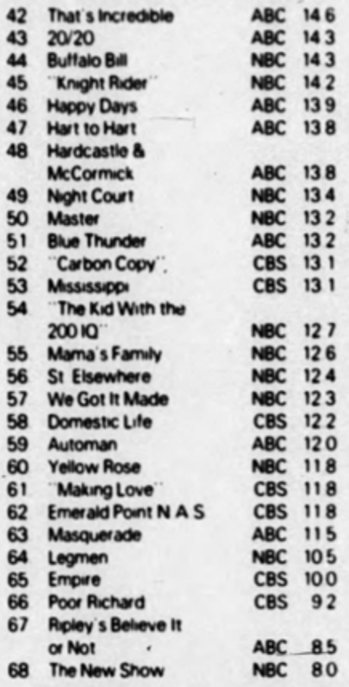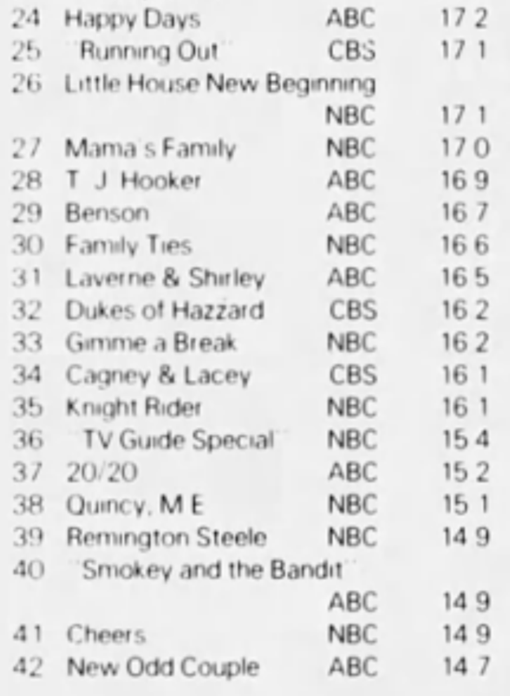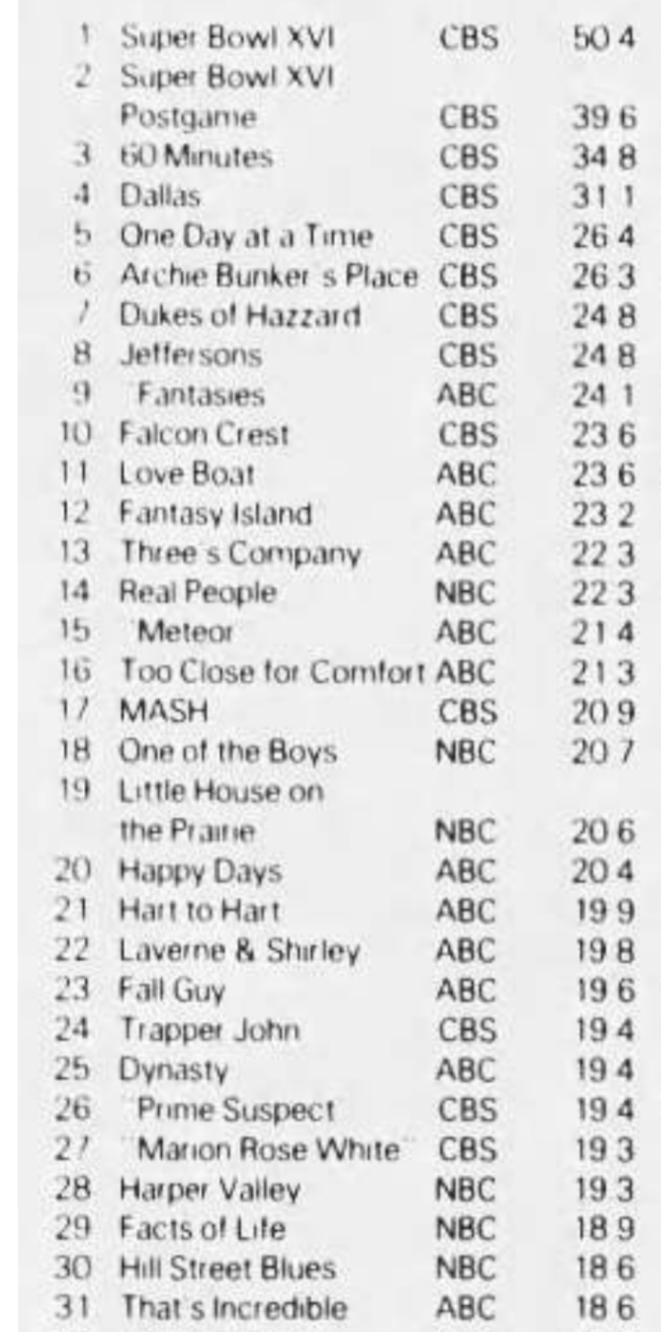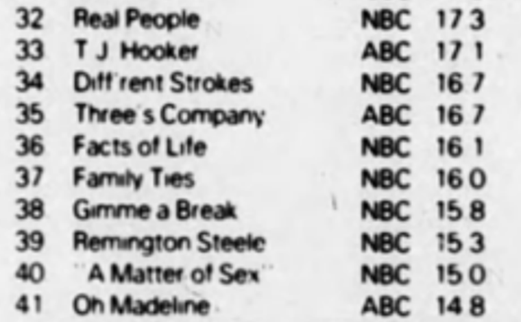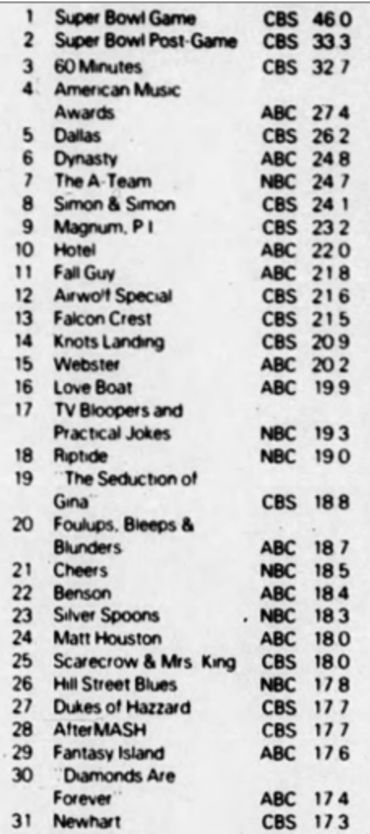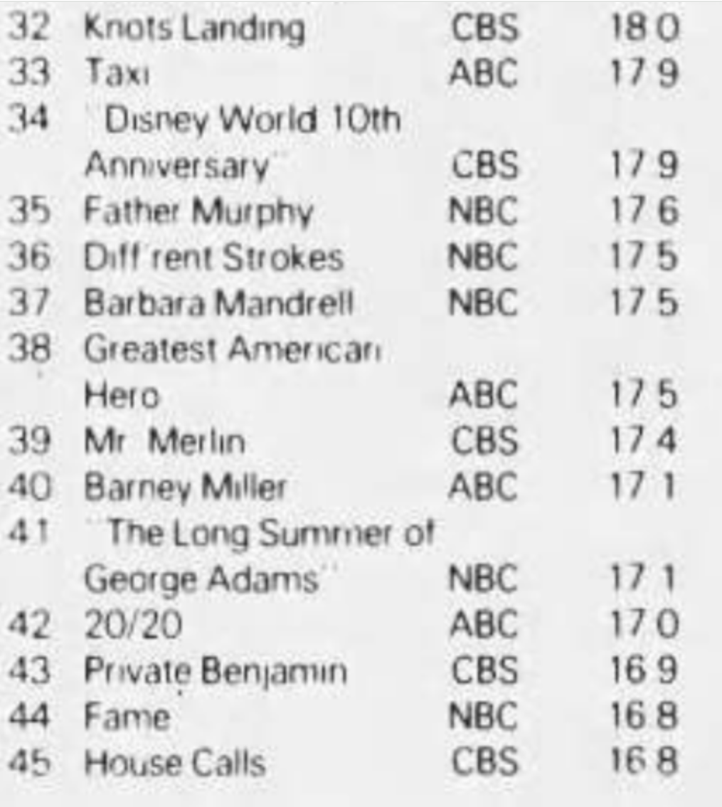 Seeing Harper Valley at #28 is a surprise. I was trying to work out where it was airing. I think by Jan 82 it was placed 8.30 Saturday but seems unlikely it would be rating that well there and not sure what the lead in would have been that week. Can any of our sleuths help me out?