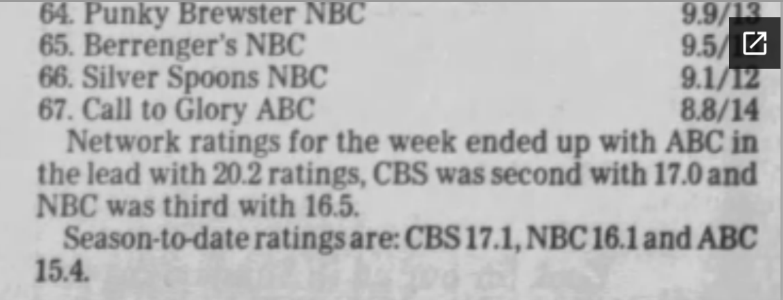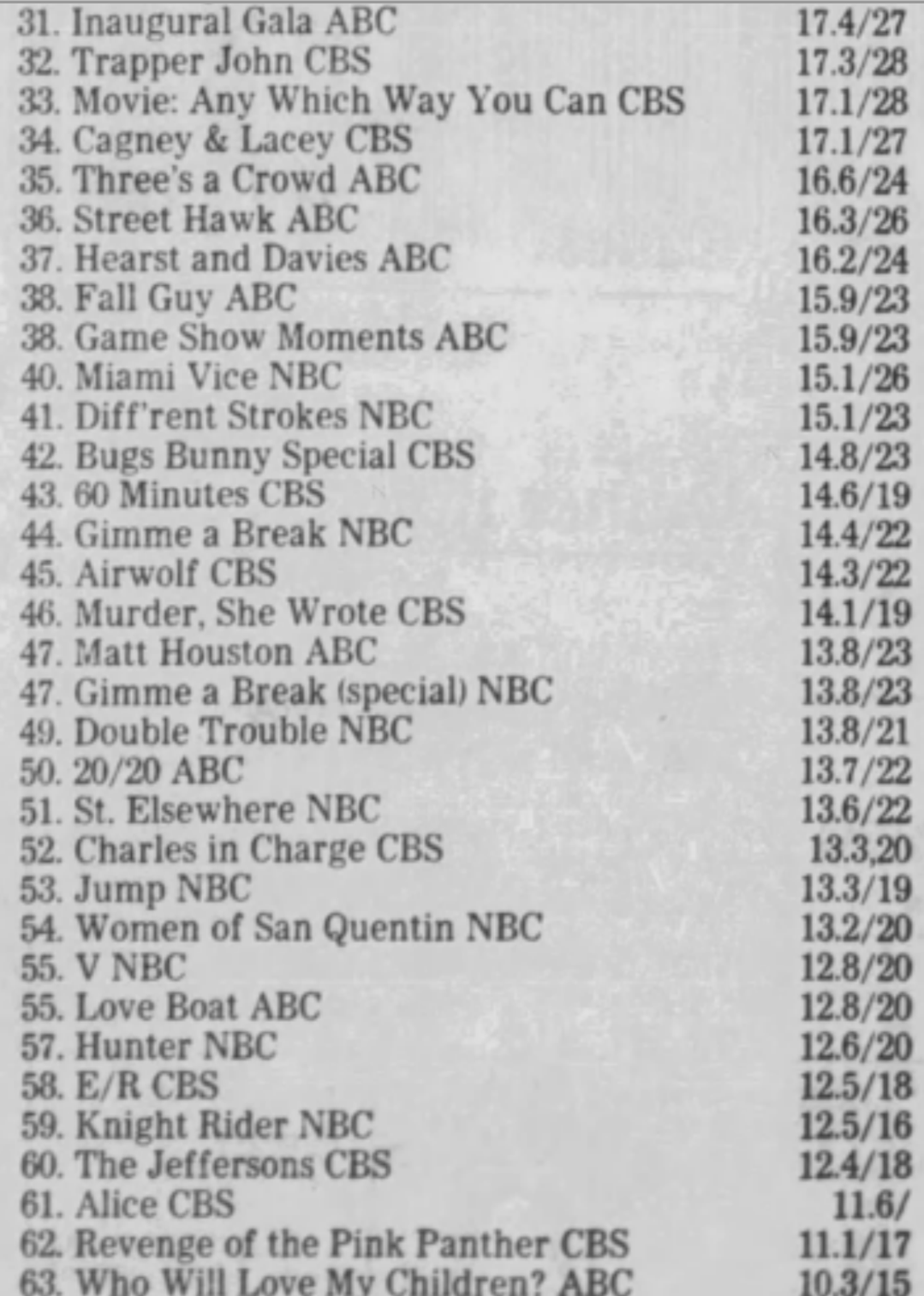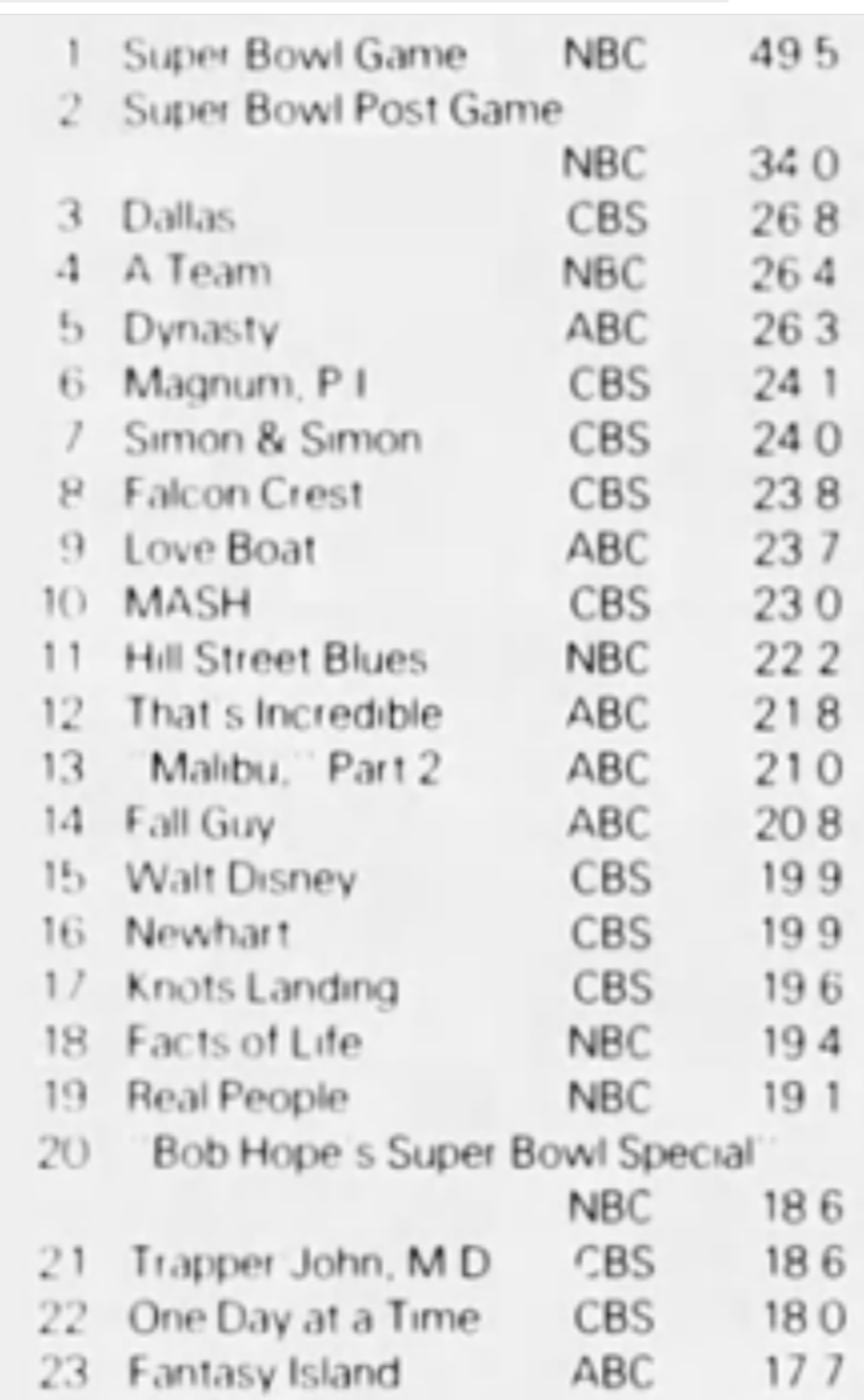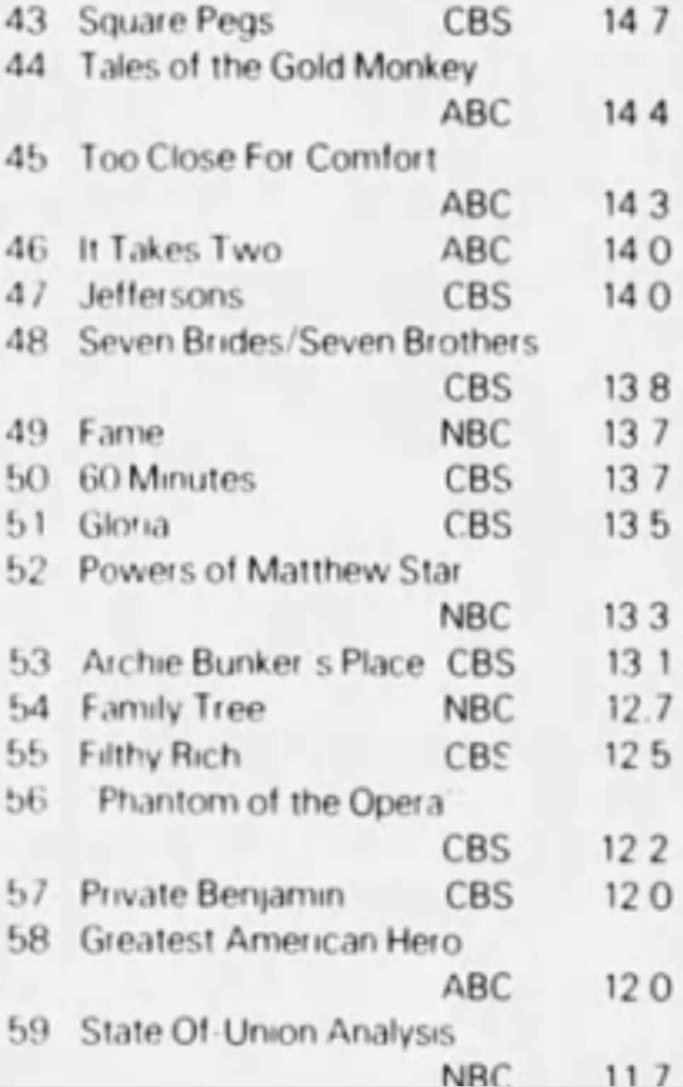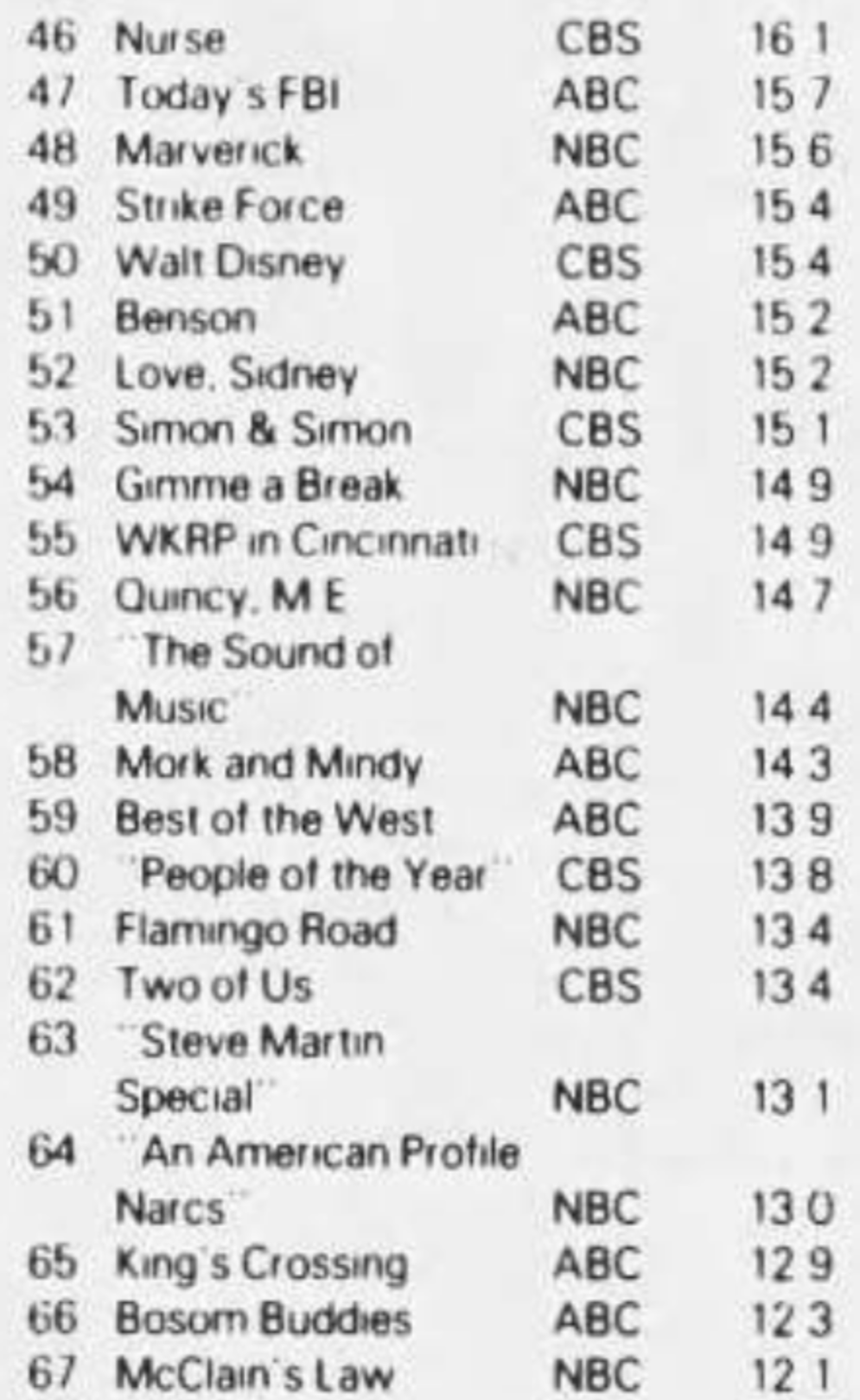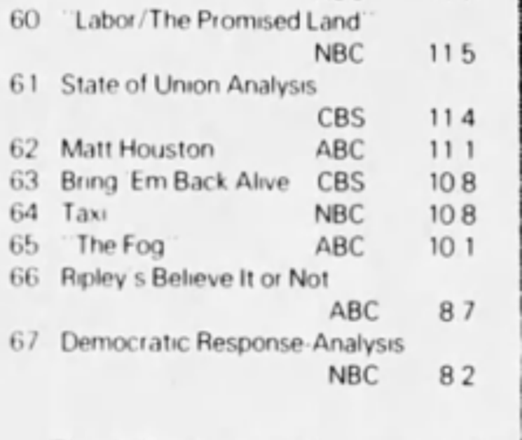 Seeing Harper Valley at #28 is a surprise. I was trying to work out where it was airing. I think by Jan 82 it was placed 8.30 Saturday but seems unlikely it would be rating that well there and not sure what the lead in would have been that week. Can any of our sleuths help me out?