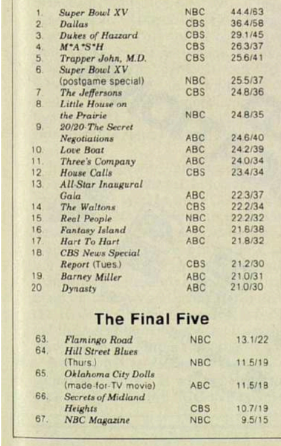 1980/81 Dallas was a killer show. 18 out 23 episodes finished #1 and the other 5 episodes finished 2nd. That season Dallas also had its highest-rated episode ever, "Who Done It?".
