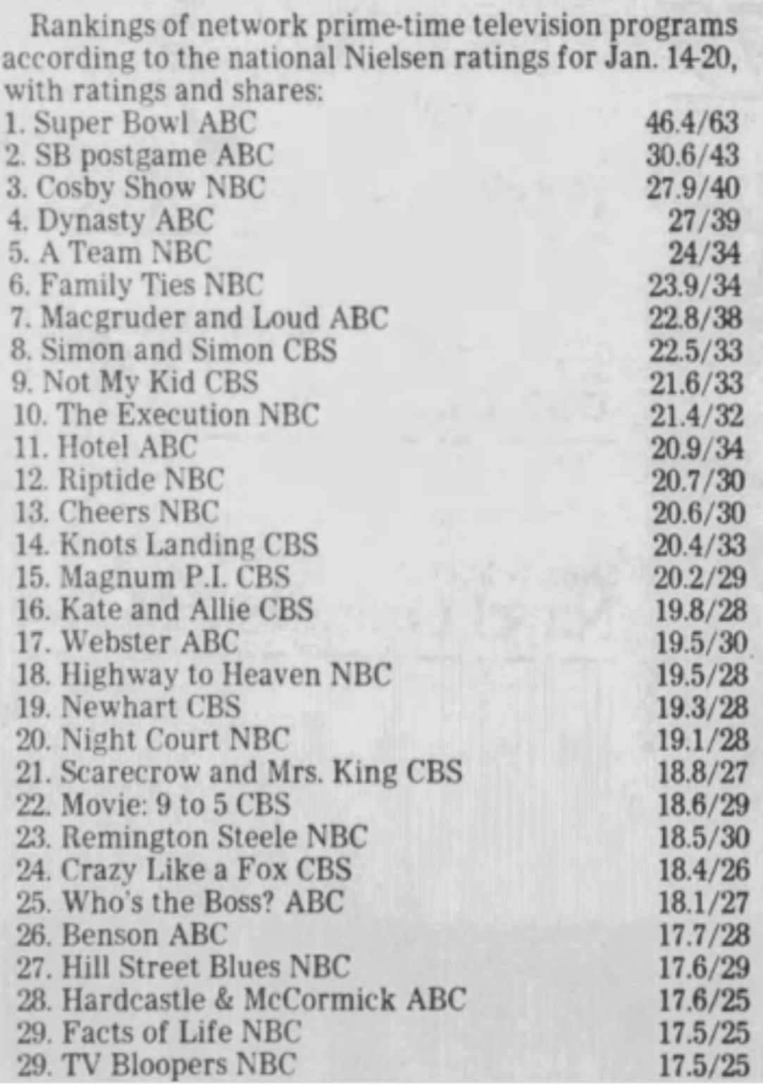 The season began with all the hype being a Dallas/Dynasty battle for #1, but the momentum shifted after the Super Bowl when new episodes of The Cosby Show began regularly finishing #1.