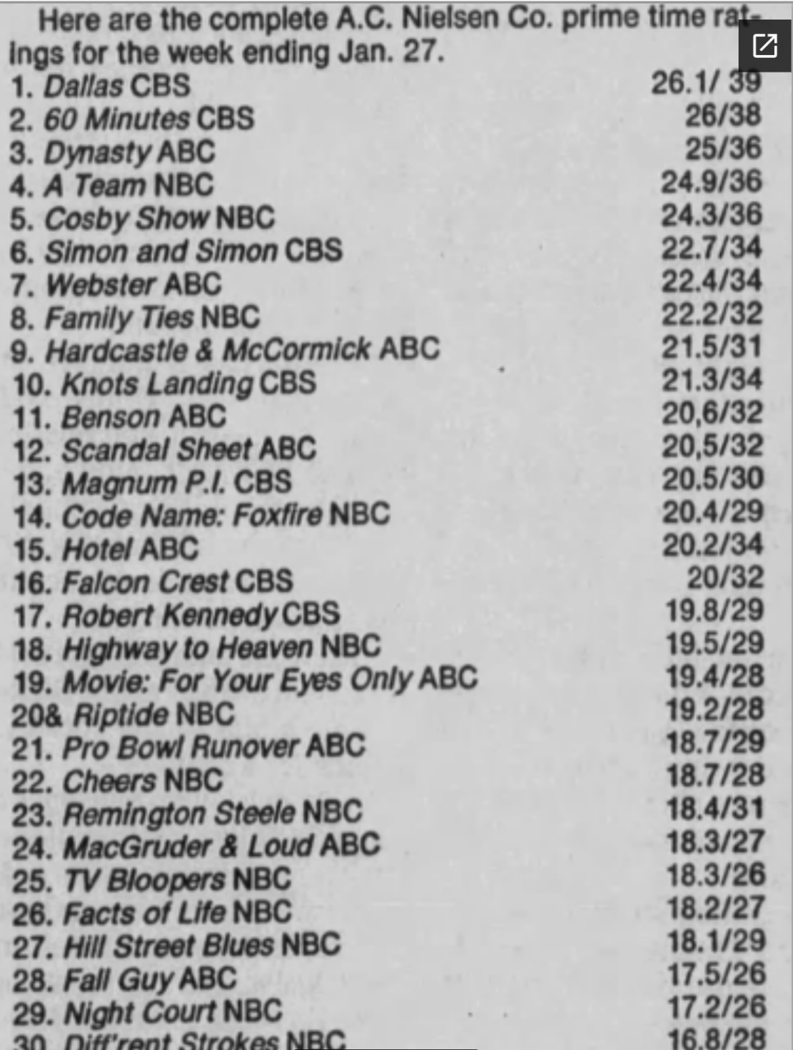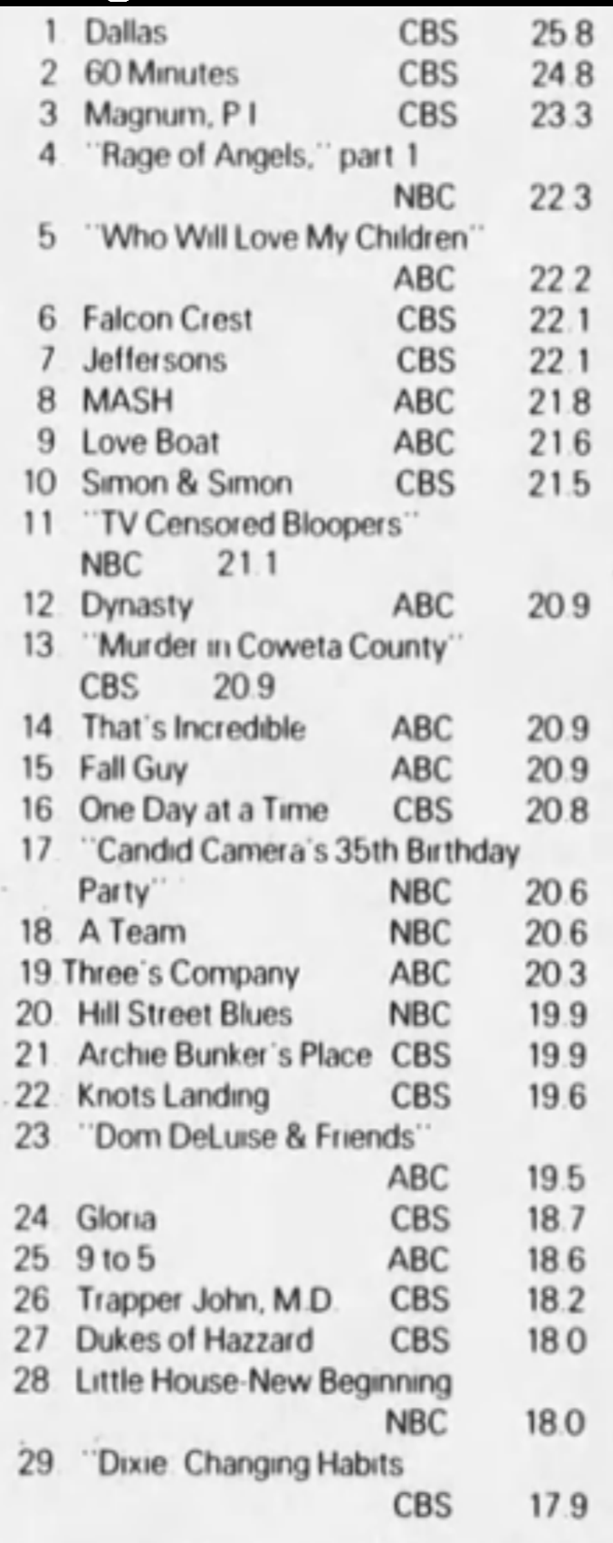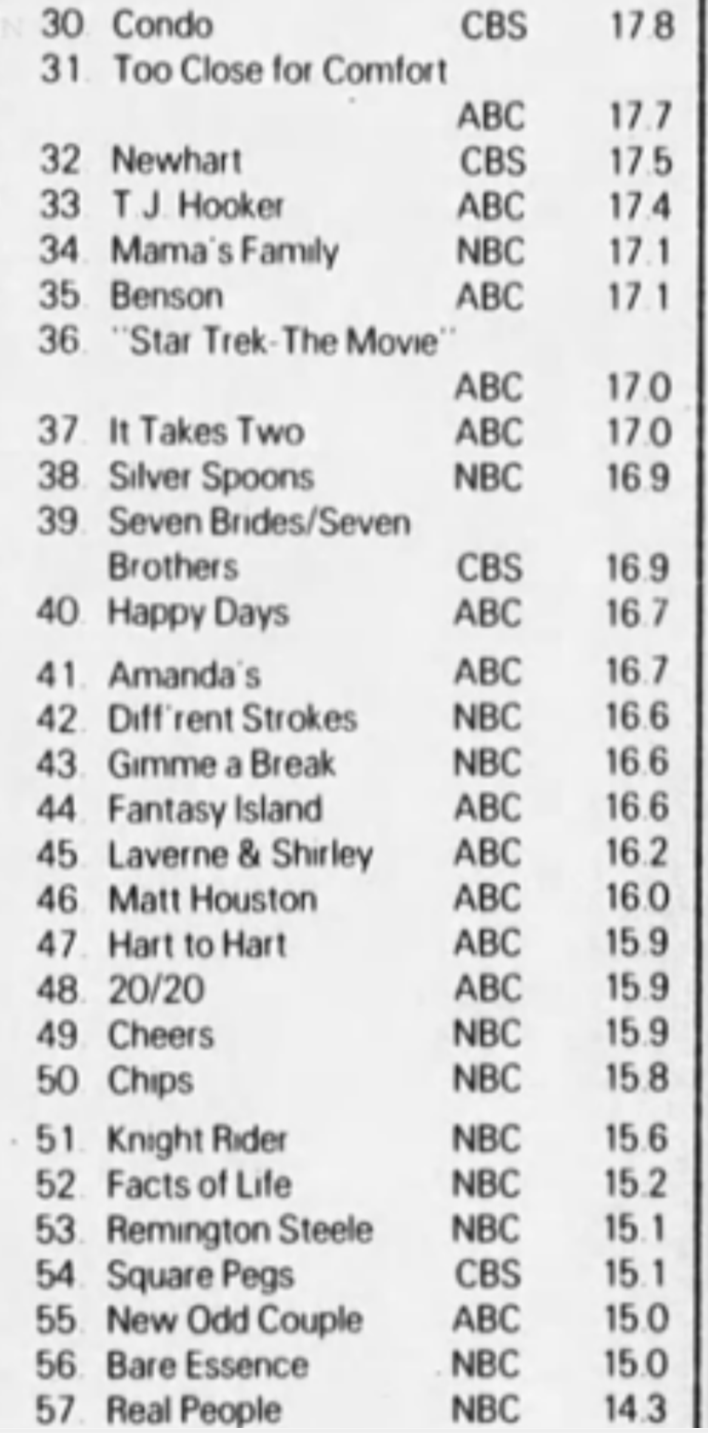 CBS win Dukes/Dallas/Falcon Crest. ABC Benson (tied with Dukes) New Odd Couple/movie'First Family' NBC Powers of Matthew Star/Knight Rider/Remington Steele (2nd best score of the season)