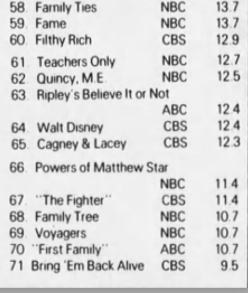 ABC win TJ Hooker/Love Boat/Fantasy Island. NBC Diffrent Strokes/Silver Spoons/Mama's Family/Teachers Only/Family Tree CBS Bring m Back alive (season low) Movie 'The Fighter'