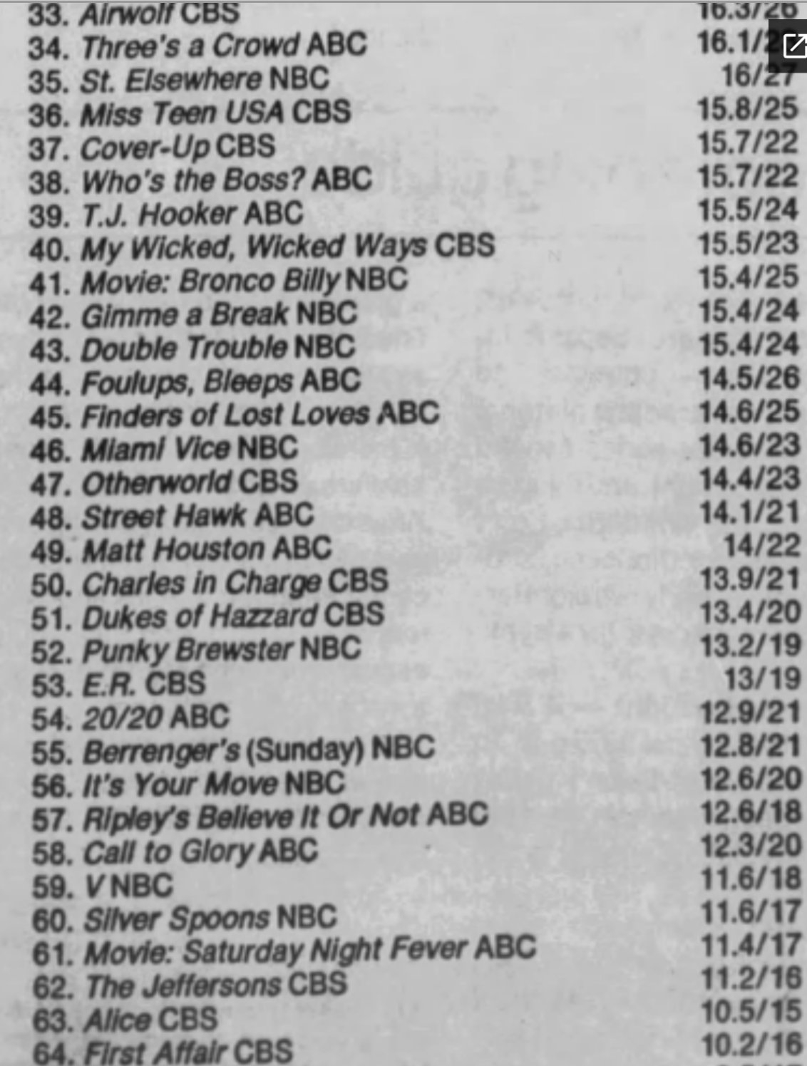 9 to 5 at #25 is interesting, it’s one of those forgotten sitcoms I enjoyed in syndication years later. The Rita Moreno version had two successful seasons but then after Jane Fonda departed as EP the shows new producers did a disastrous revamp and got cancelled early on in its third season. Later it came back in syndication for another three seasons with Sally Struthers as the lead actress.