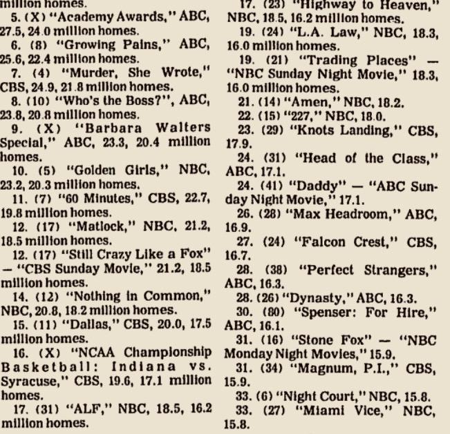 1987/88: 48 Hours. Beauty and the Beast, Tour of Duty, Wiseguy all maybes.