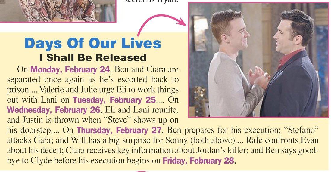 Feb. 24: Victor pressures Will not to expose Maggie Feb. 25: Sarah and Eric are faced with a difficult decision Feb. 27: Will has a big surprise for Sonny Feb 28: Stefano tells Justin he wants Marlena in exchange for Kayla