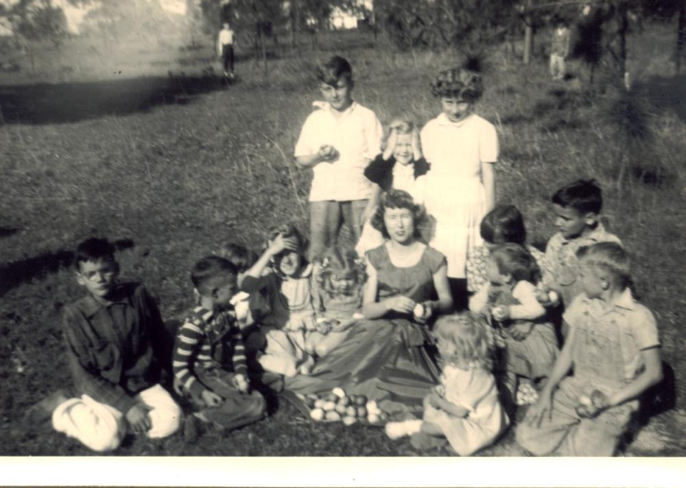 am using this old family photo for my Easter greetings because it is an Easter egg hunt in the 1940s in rural deep south Mississippi. In the center is my mother & around her are all of these cousins. This picture was obviously staged. If it had not been, there wouldn't have been one person of her age with a whole bunch of much younger cousins. Of course at that time photography was quite a bit rarer than today. I really like this photo mostly because everyone seems so natural. Also for its age its held up pretty well.