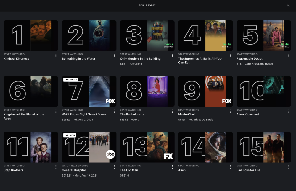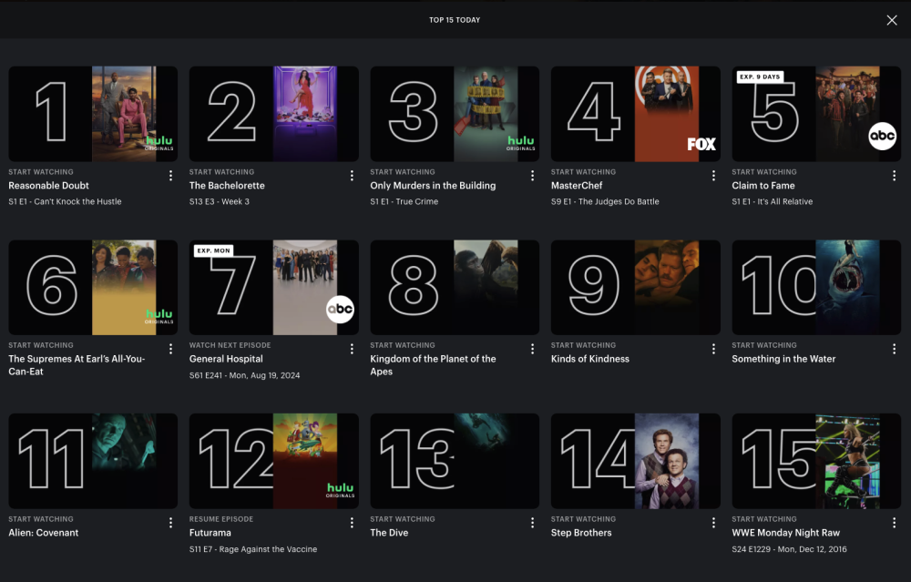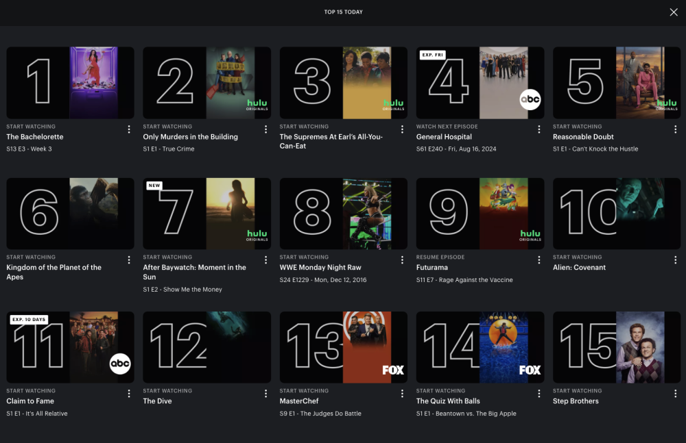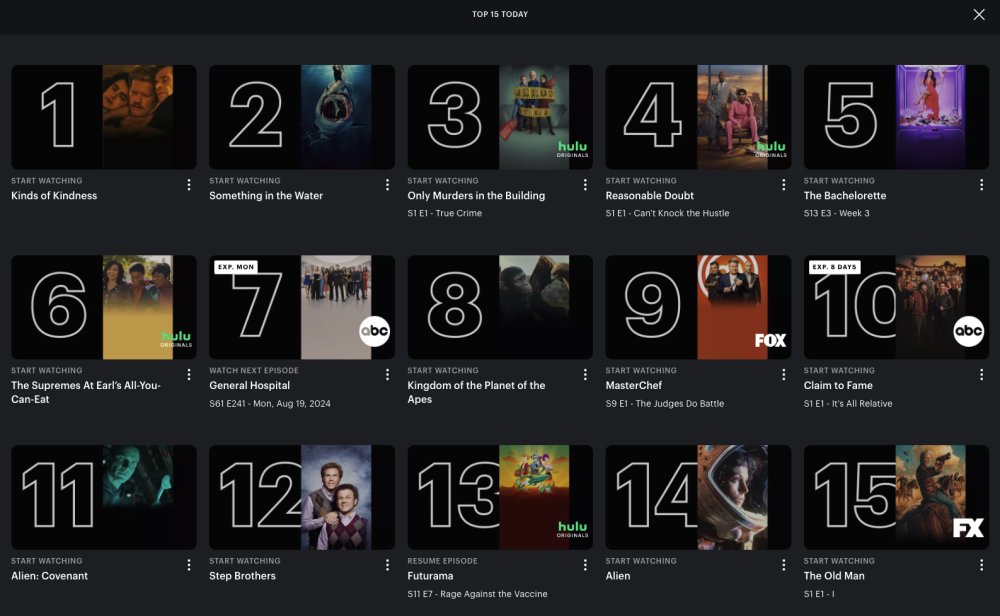 To add to @John's post, GH was #5 on Wednesday, September 4, 2024 on the Hulu Top 15 Today chart. It is #4 today, Thursday, September 5, 2024 (see below).