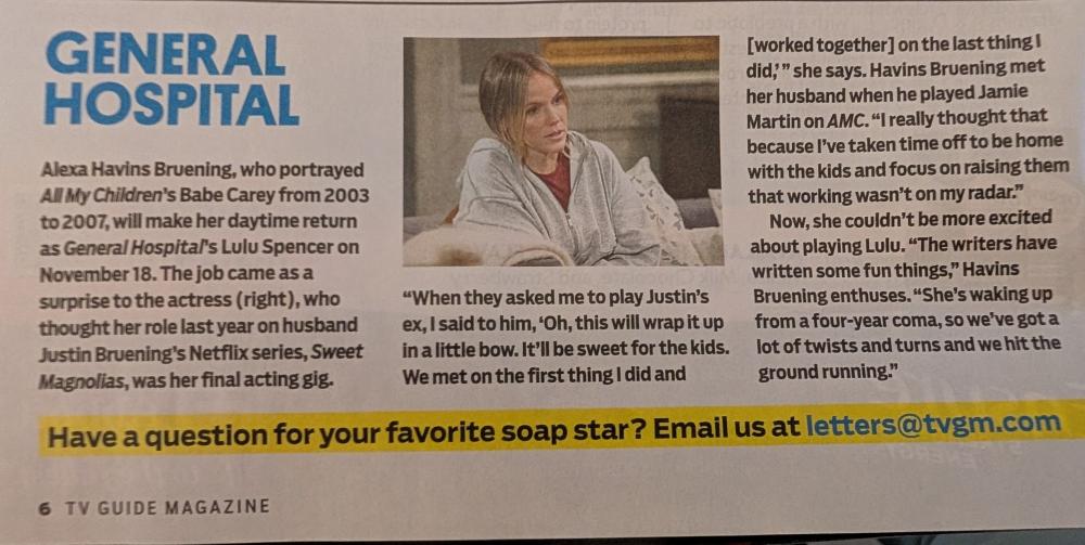 • I have long given up on logic and Mayor Laura Collins! It makes about as much sense as Luke being elected mayor over Lee Baldwin in the 80’s, maybe even less sense. She committed manslaughter as a teenager, was involved with a mobster (I guess credit for them taking Smith down), had a shoot out in her home and killed another mobster in self defense, thought she bludgeoned her stepfather to death, then was catatonic for years. Her current husband had a twin that was a serial killer, had his own breakdown that threatened lives, and most recently hid his brother for treatment and that allowed Ryan to escape and kill again. And had hook killer Esme as a houseguest and is raising her child. I don’t care for Sonny anymore but their relationship is just another thing that involves suspension of belief to watch the show. I wish someone on this show would remind these adults that they used to pull way worse stuff than this! I would love a scene where Laura is sitting with Lulu and tells her while she is not happy this is nothing compared to what she got up to when she was young, and maybe even some understanding that she would also do stupid stuff if she believed in the cause. Olivia reminding Dante that he was wild as a teen and this isn’t that. Felicia reminding Anna that they were being shot at when pretty close to Emma’s age. These characterizations are just so basic. Have some fun with the actual history of the show. That kind of wink would mean more to me than just name dropping some random fact.